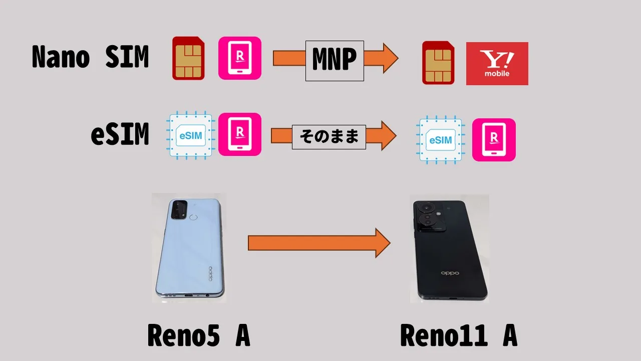 私の場合は、SIM2回線とも楽天モバイルで使っていたのを、サブ回線の物理SIMの方をMNPでヤフーモバイルに移行させて、メイン回線のeSIMは楽天モバイルのまま新機種に移行となります。